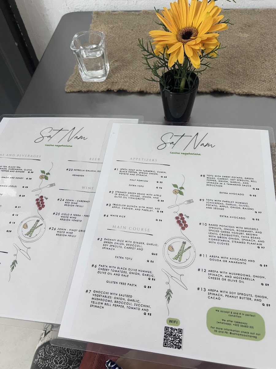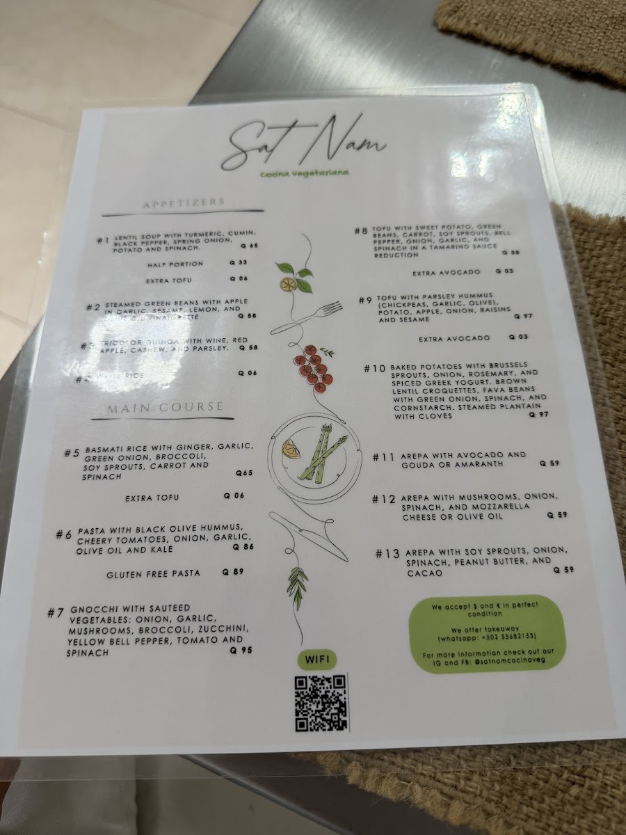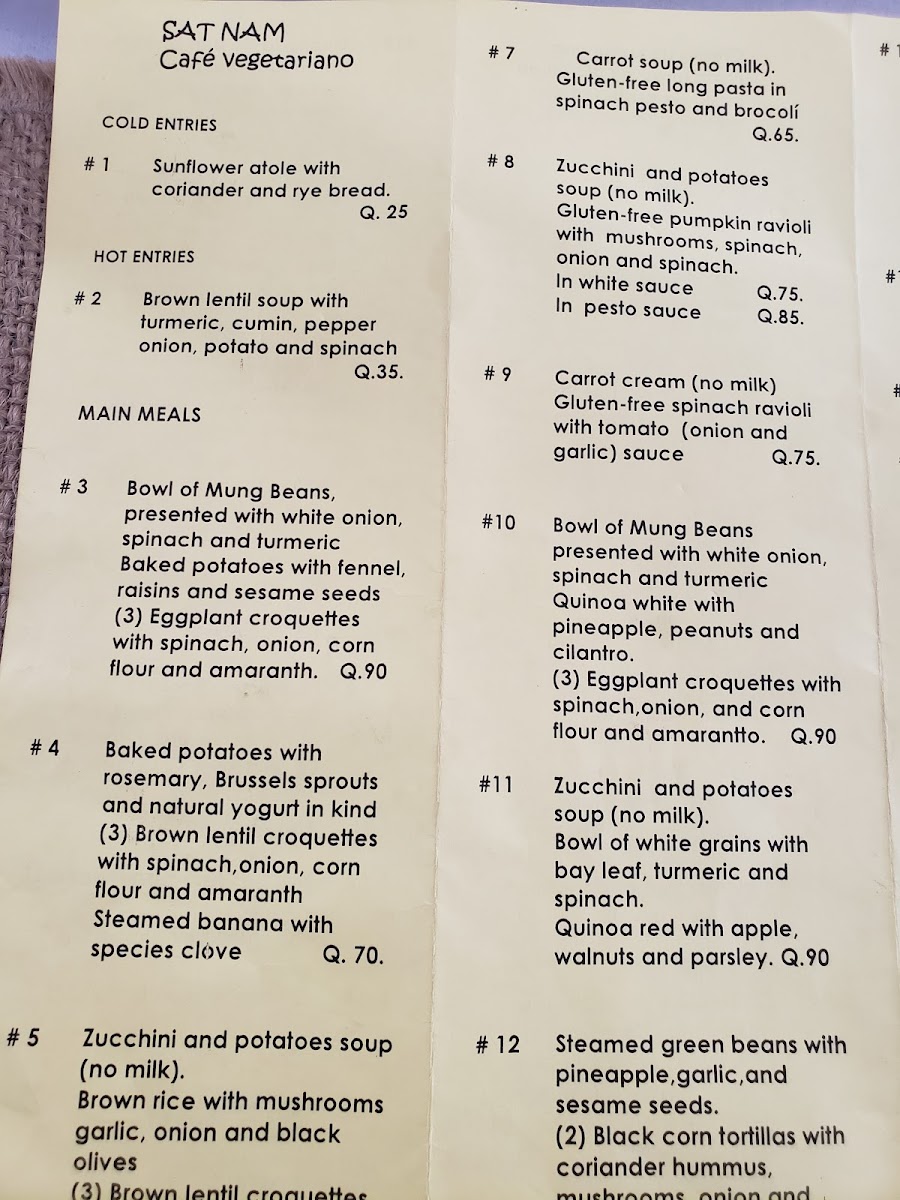 At Sat Nam Cocina Vegetariana, located at 4 Calle Oriente in the heart of Antigua Guatemala, the menu feels carefully curated rather than crowded, with each dish reflecting a clear vegetarian philosophy focused on freshness, balance, and comforting simplicity. The selection stands out for its ability to transform familiar ingredients into satisfying plates that feel both wholesome and thoughtfully prepared. Avocado and Cheese is a highlight that captures this approach perfectly, combining creamy textures and mild flavors in a way that feels indulgent yet clean, making it an easy favorite for those who appreciate straightforward vegetarian comfort food. Equally appealing is Steamed Green Beans With, a dish that emphasizes natural flavors and light preparation, showing restraint and respect for the ingredients rather than unnecessary embellishment. Together, these standout items summarize the overall direction of the menu: unpretentious, nourishing, and aligned with diners who value plant-based meals that are flavorful without being heavy. As a whole, the menu leaves the impression of consistency and intention, where each dish contributes to a cohesive vegetarian dining experience rather than competing for attention, making Sat Nam Cocina Vegetariana a reliable choice for those seeking simple, well-executed vegetarian cuisine in Antigua.