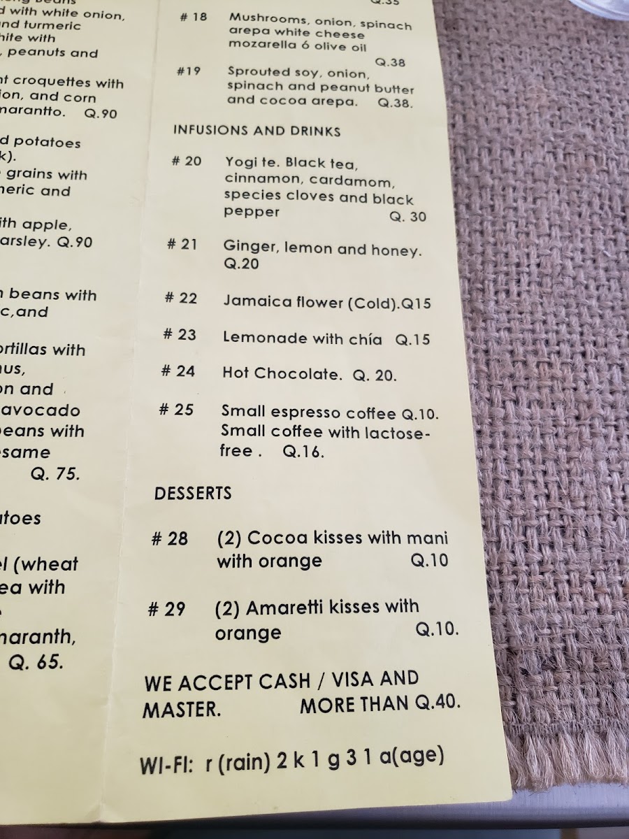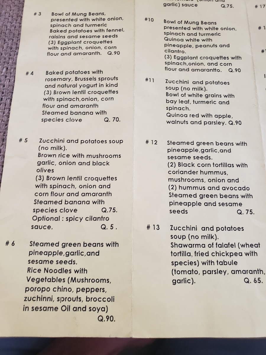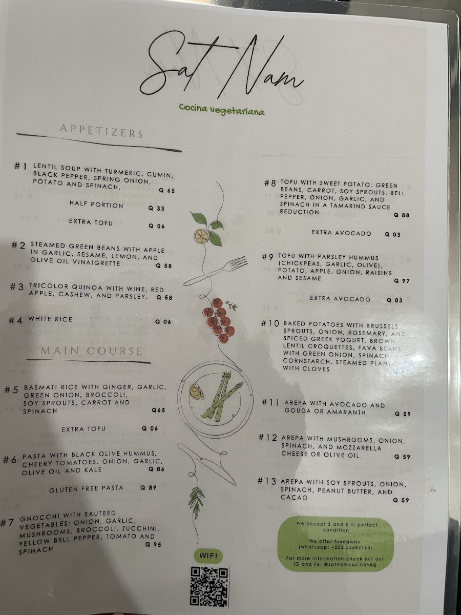 At Sat Nam Cocina Vegetariana, located at 4 Calle Oriente in the heart of Antigua Guatemala, the menu feels carefully curated rather than crowded, with each dish reflecting a clear vegetarian philosophy focused on freshness, balance, and comforting simplicity. The selection stands out for its ability to transform familiar ingredients into satisfying plates that feel both wholesome and thoughtfully prepared. Avocado and Cheese is a highlight that captures this approach perfectly, combining creamy textures and mild flavors in a way that feels indulgent yet clean, making it an easy favorite for those who appreciate straightforward vegetarian comfort food. Equally appealing is Steamed Green Beans With, a dish that emphasizes natural flavors and light preparation, showing restraint and respect for the ingredients rather than unnecessary embellishment. Together, these standout items summarize the overall direction of the menu: unpretentious, nourishing, and aligned with diners who value plant-based meals that are flavorful without being heavy. As a whole, the menu leaves the impression of consistency and intention, where each dish contributes to a cohesive vegetarian dining experience rather than competing for attention, making Sat Nam Cocina Vegetariana a reliable choice for those seeking simple, well-executed vegetarian cuisine in Antigua.